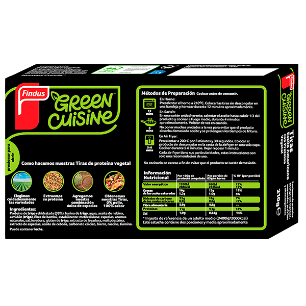 Descubre las deliciosas Tiras estilo americano 0% POLLO de Green Cuisine, elaboradas a partir de proteína trigo. Descubre su rebozado crujiente al puro estilo americano. Te aportaran toda la energía que necesitas para tu día a día, gracias a su aporte de proteína y fibra.